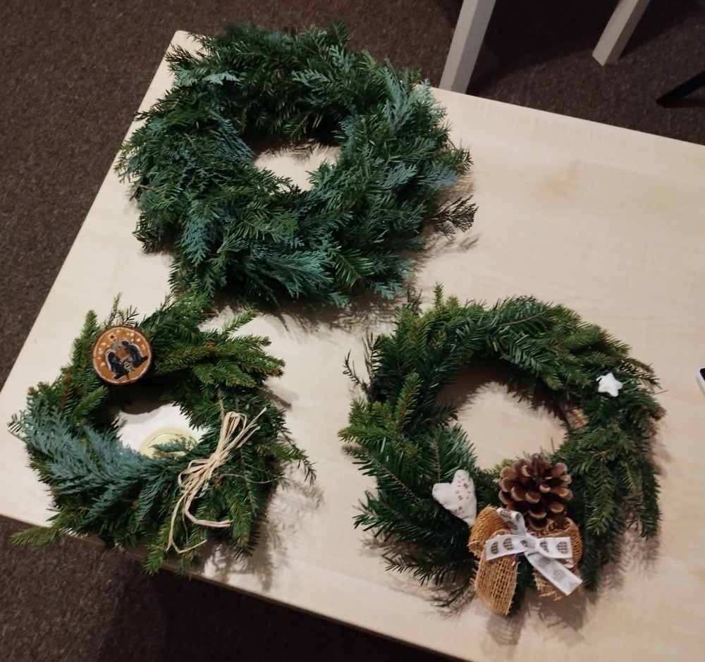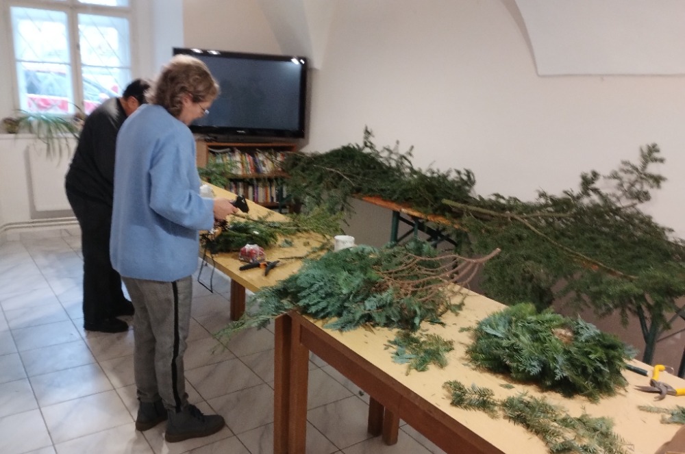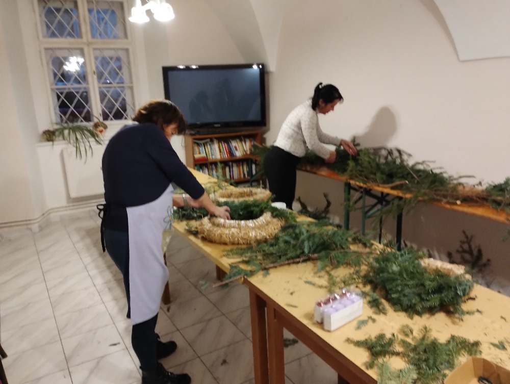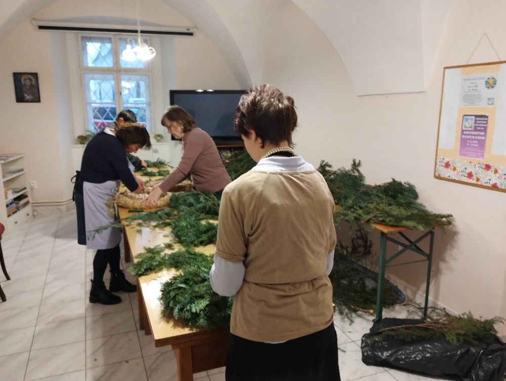 Příprava na advent již začala i v centru a to ve středu 26. 11. od 13 hod. Díky panu Pořízkovi jsme měly k dispozici spoustu chvojí, které okamžitě provonělo celou místnost. Průběžně během odpoledne přicházely ženy, které si vytvořily věnec do svého domova ať už na stůl, nebo na pověšení. Vzájemně jsme se inspirovaly a podporovaly v technice tvoření, povídaly si a sdílely ve svých radostech i starostech až do 18. hodiny.