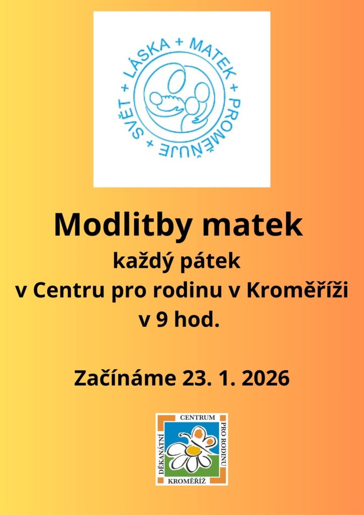 pokud nejste v žádné skupince modliteb matek a chtěli byste se modlit za své děti a vnoučata, může přijít každý pátek v 9 hodin do Centra pro rodinu v Kroměříži, kde se budeme z brožurek Modlitby matek společně modlit. Začínáme v pátek 23. 1. 2026.